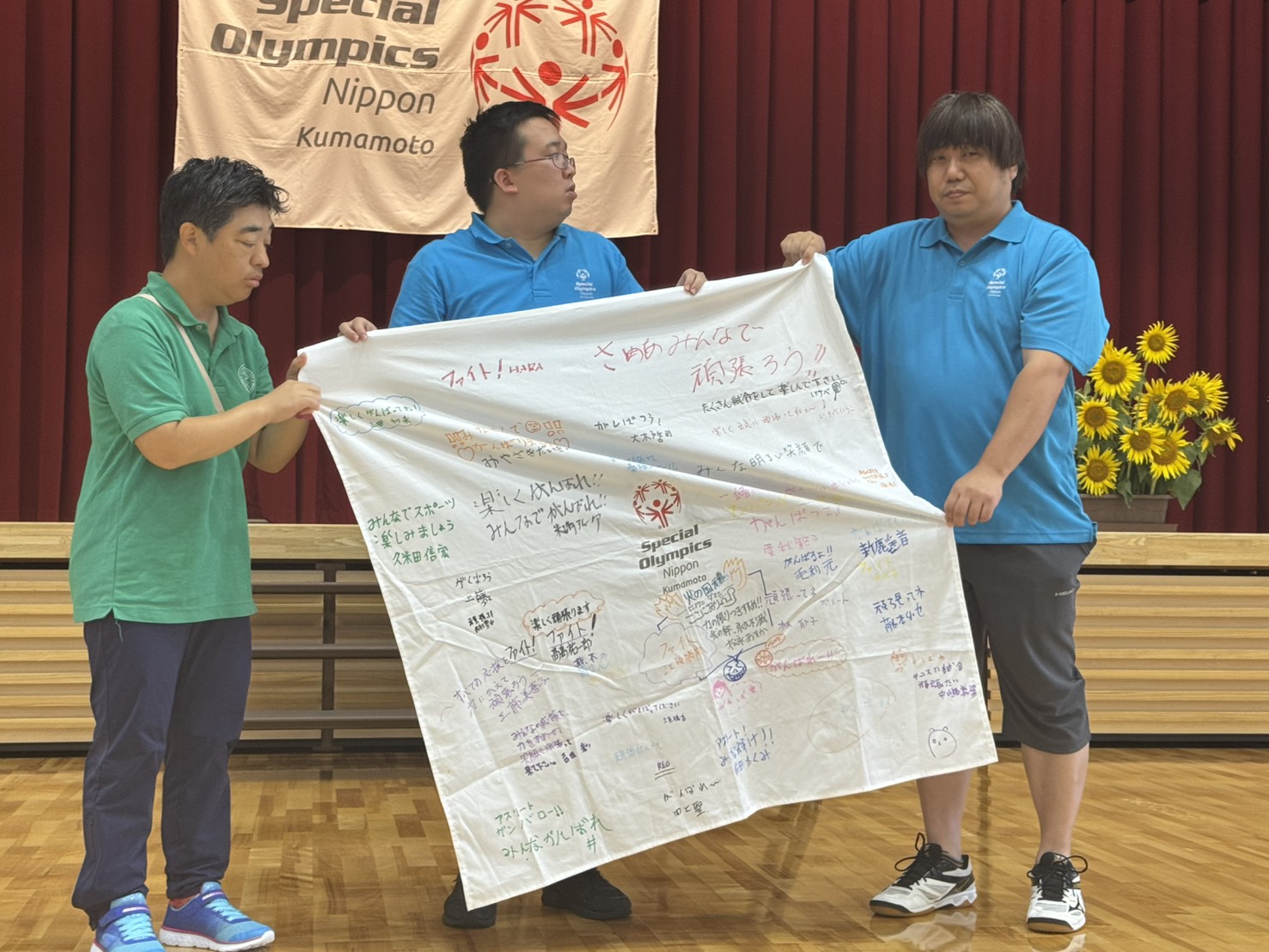 その後、11月の地区大会の熊本選手団結団式を行いました。竹屋団長の挨拶後、みんなからの応援メッセージが記された応援フラッグが江崎アスリート委員長から選手団代表の緒方愛さん(陸上競技出場)と糸山誠悟さん(競泳出場)の2人に手渡されました。