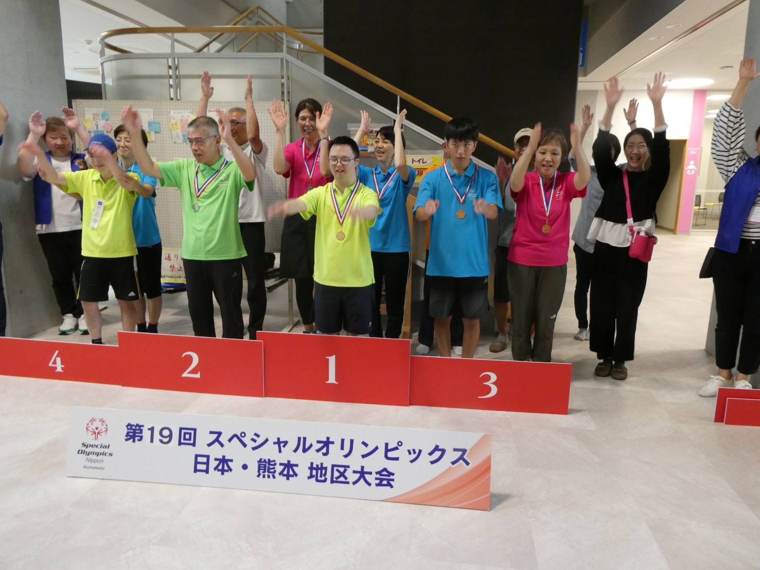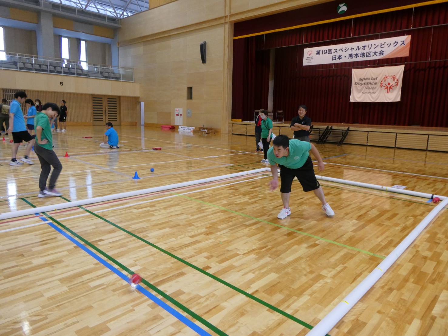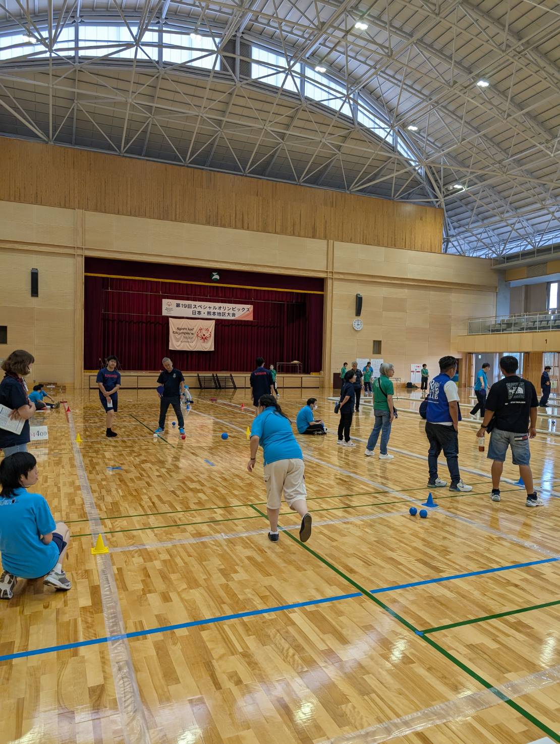 SOボッチャ競技会は雨の心配があり、屋外ではなく、体育館でパラボッチャのボールを使って行いました。枠を使ったコートが2つ、テープで作ったコートが3つ。まずは5つのディビジョンに分かれて、個人戦。その後、5チームが2つのディビジョンに分かれて熱戦を展開しました。エアコンの効いた体育館で、ボランティアの開新高校の生徒さんたちのサポート・応援を受けて頑張りました。