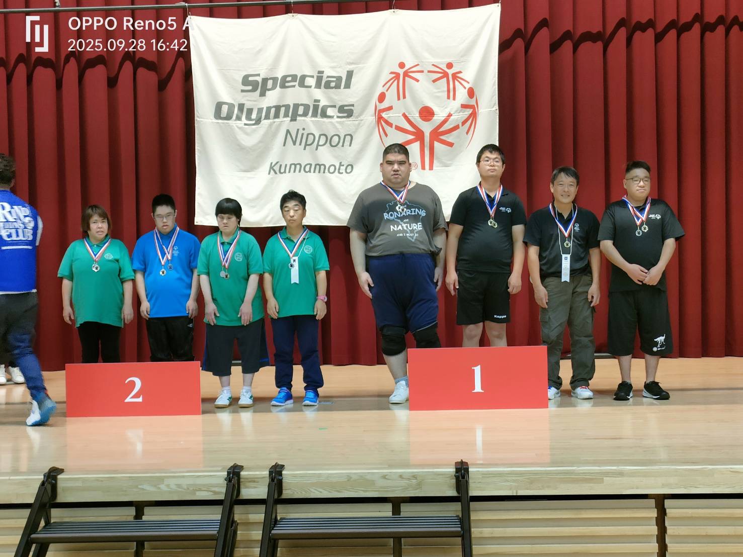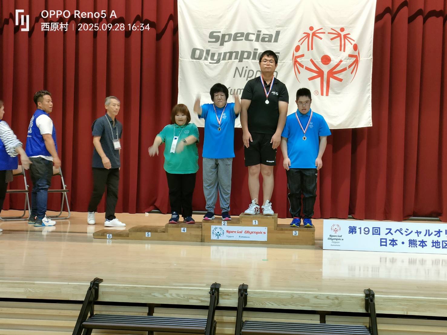 競技が終了すると雨が降り出し、表彰式は体育館のエントランスで行いました。