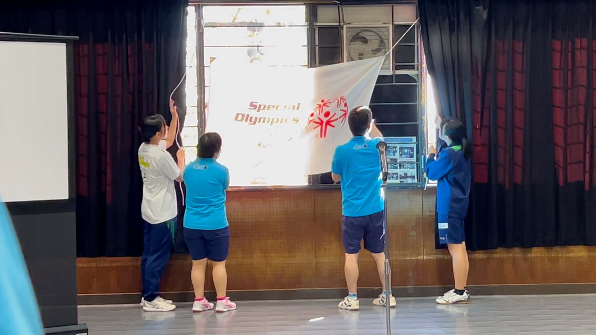 1ヶ月アスリートの熱戦を見守ってきたSO旗の降納。卓球のアスリートの山部和也さん、西村有加里さんと国府高校のボランティア学生。