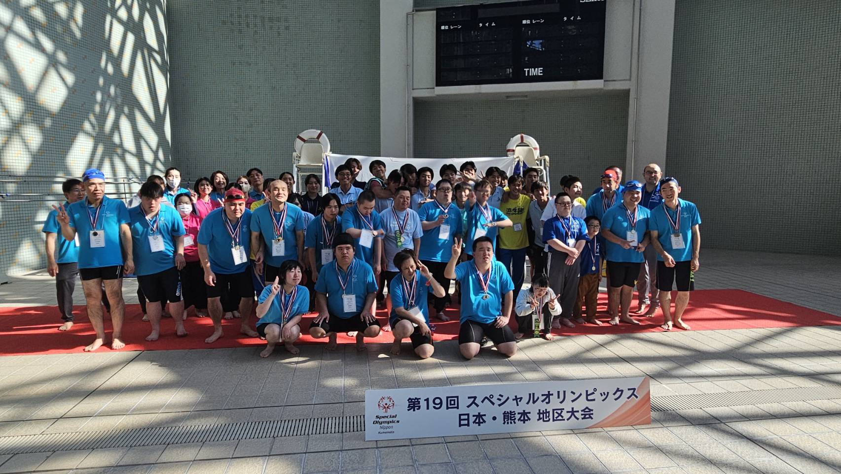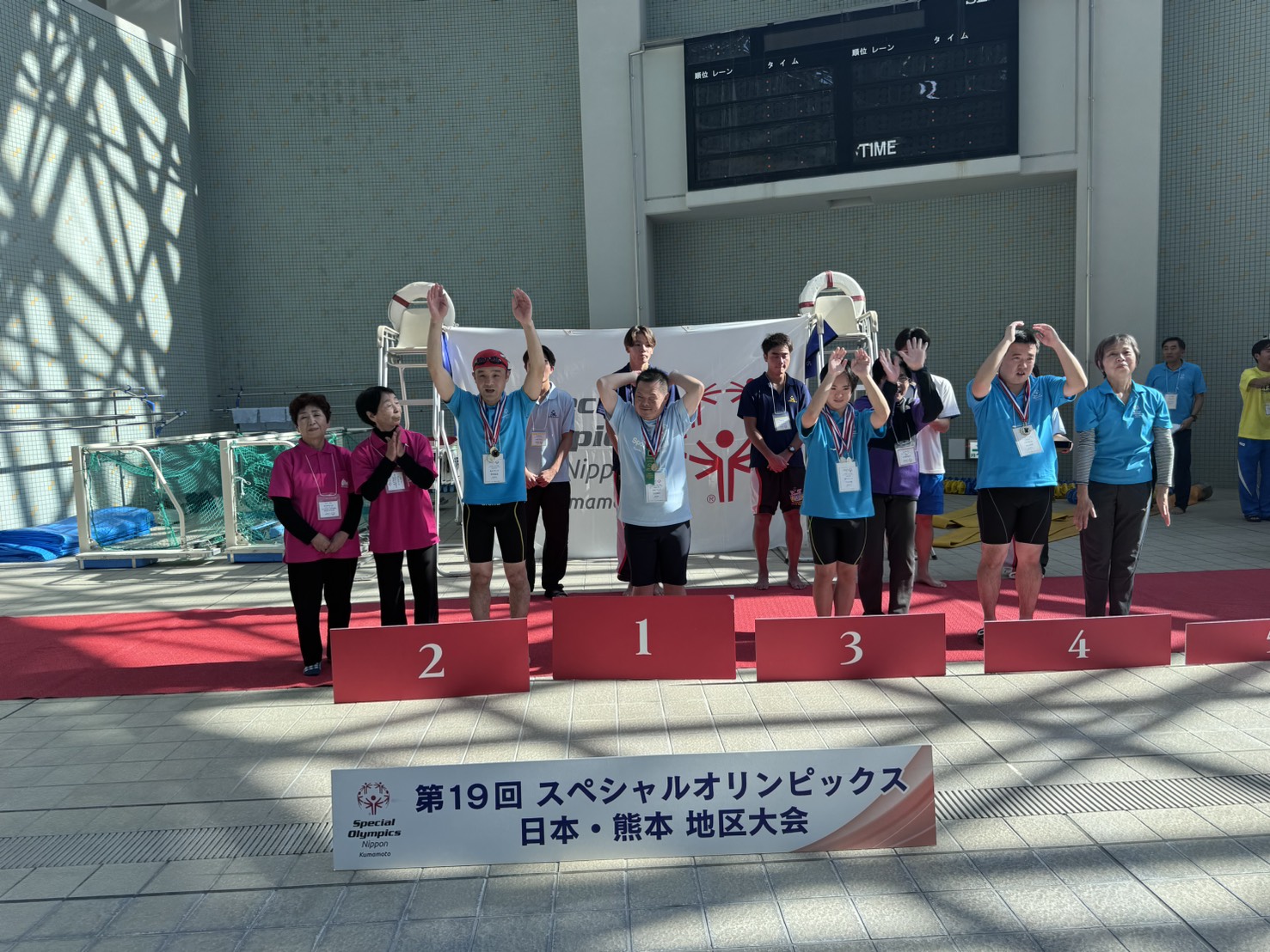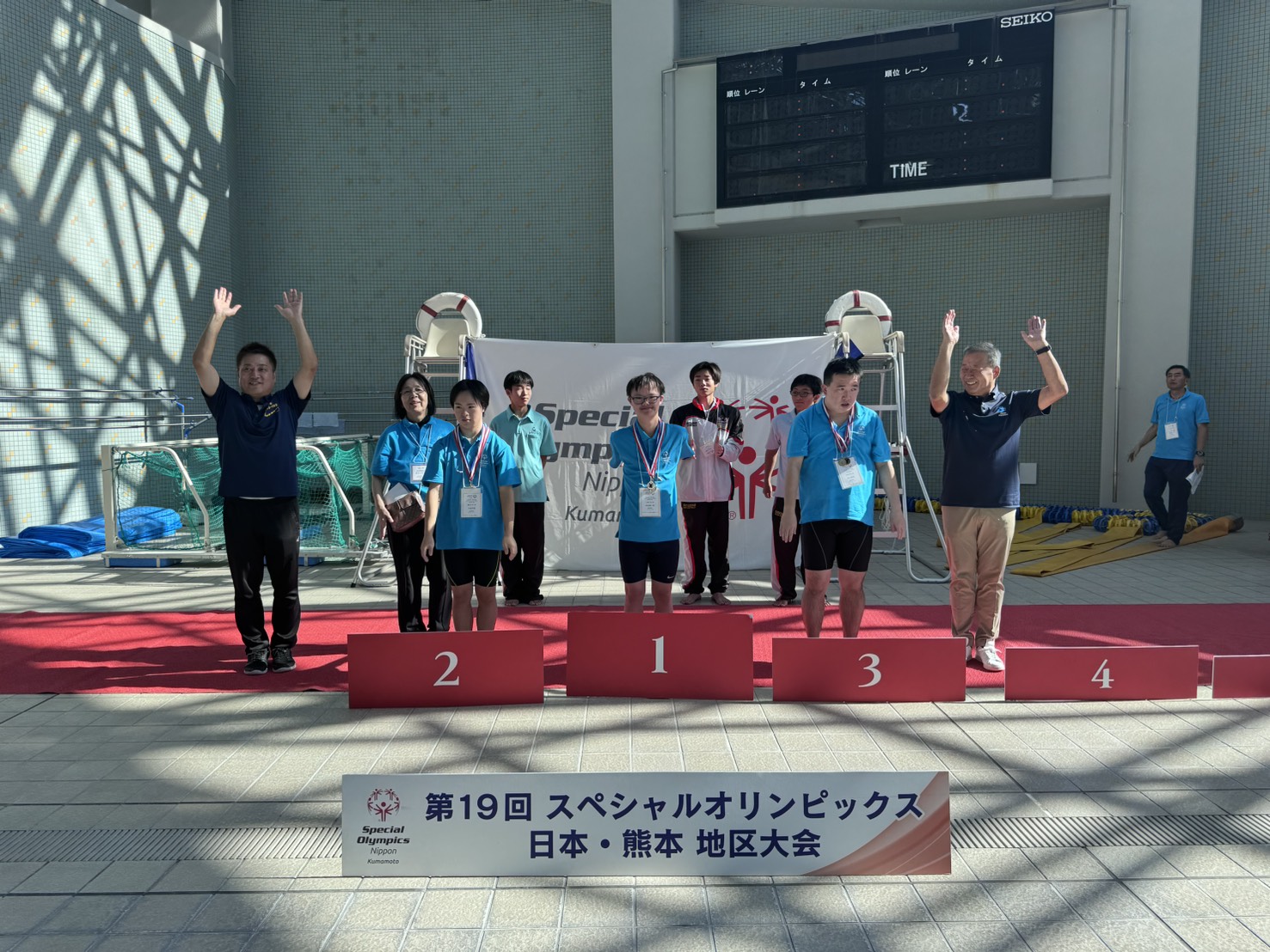 第7日 競泳競技会が開催されました。 2025.12.05 yoshida 11月30日(日)にアクアドームくまもとで競泳競技会が開催されました。アスリートたちの力泳に会場は歓声が響き渡りました。 表彰式ではたくさんの笑顔が。 達成感あふれるアスリートと支えてくださった皆さんと記念撮影。